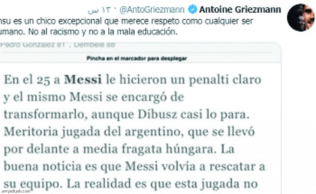دافع الفرنسي أنتوني جريزمان، لاعب فريق برشلونة الأول لكرة القدم، عن الإسباني أنسوفاتي زميله، بعدما شبهت إحدى الصحف ركضه السريع في المباريات مثل الباعة الأفارقة في شوارع برشلونة، الذين يهربون من الشرطة لعدم القبض عليهم. وقال اللاعب الدولي في تغريدة نشرها عبر حسابه على موقع التواصل الاجتماعي “تويتر”: “أنسوفاتى استثنائي يستحق الاحترام كأي إنسان.. لا للعنصرية ولا للوقاحة”.