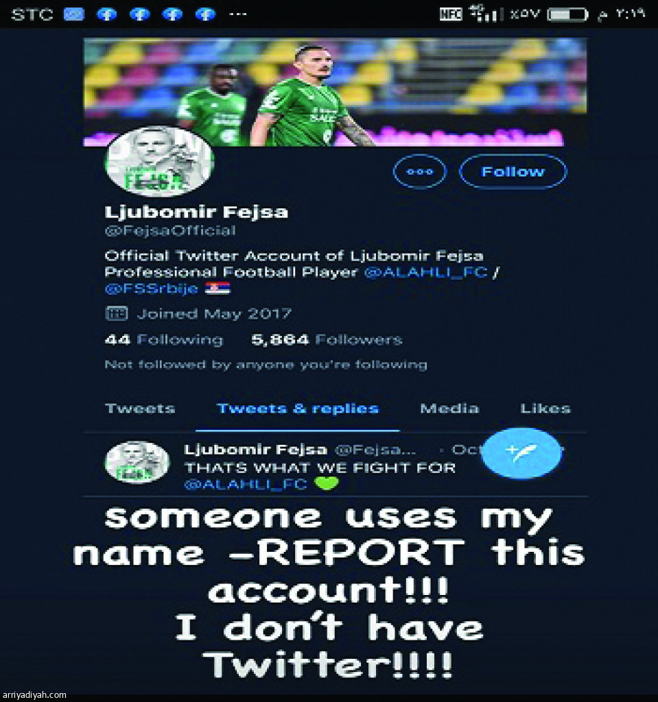 حذر الصربي ليوبومير فيجسا لاعب الأهلي عبر حسابه على إنستجرام من حساب في موقع التواصل الاجتماعي “تويتر” ينتحل اسمه، ويغرد بتغريدات عن الفريق كأنها تصريحات رسمية منه، مطالبًا بمساعدته في التبليغ عنه لإغلاقه.