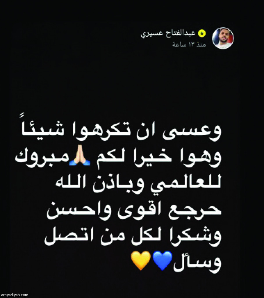 قدَّم عبد الفتاح عسيري، لاعب فريق النصر الأول لكرة القدم، في حسابه على “سناب شات”، الشكر إلى كل من اتصل عليه وسأل عنه، بعد الإصابة التي تعرض لها في مباراة الأهلي، مؤكدًا أنه سيعود أقوى وأحسن.