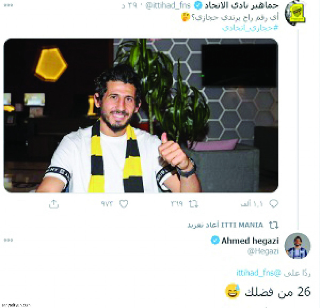 اختار المركز الإعلامي في نادي الاتحاد الإعلان عن الرقم الذي سيرتديه المصري أحمد حجازي، لاعب الفريق الأول لكرة القدم الجديد، بشكل جديد. ونشر حساب النادي على موقع التواصل الاجتماعي “تويتر” صورة لحجازي، وعلّق قائلًا: “أي رقم راح يرتدي حجازي” قبل أن يرد اللاعب على التغريدة بقوله: “26 من فضلك”. وبلغت الردود على التغريدتين 2.2 ألف، إلى جانب 1.9 ألف ريتويت، و3.1 ألف تفضيل.