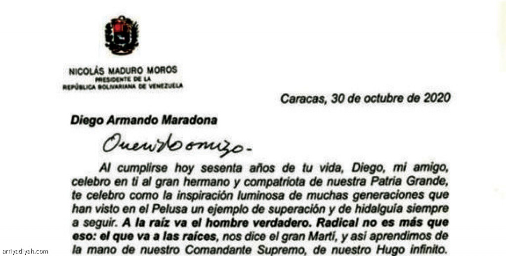 شكر دييجو مارادونا، أسطورة الكرة الأرجنتينية، نيكولاس مادورو، الرئيس الفنزويلي، وحرمه على تهنئتهم له بذكرى ميلاده الستين. وعرض مارادونا خطاب التهنئة على حسابه في إنستجرام وعبّر عن امتنانه لهما.