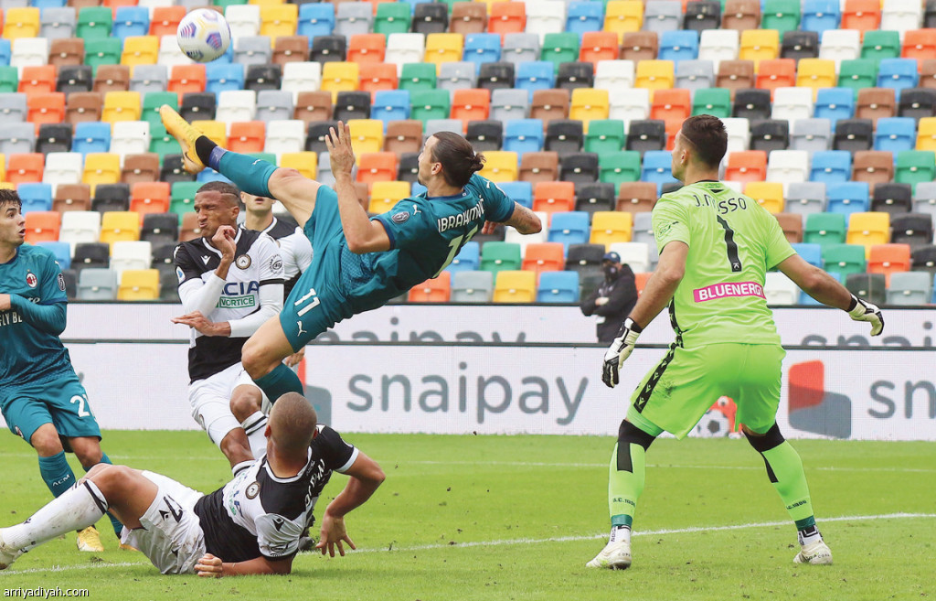 صورة التقطت أمس لإبراهيموفيتش لحظة قفزه في الهواء وتحويل الكرة في شباك أودينيزي مسجلاً هدف الفوز لفريقه ورفع به رصيده إلى سبعة أهداف في صدارة الهدافين
