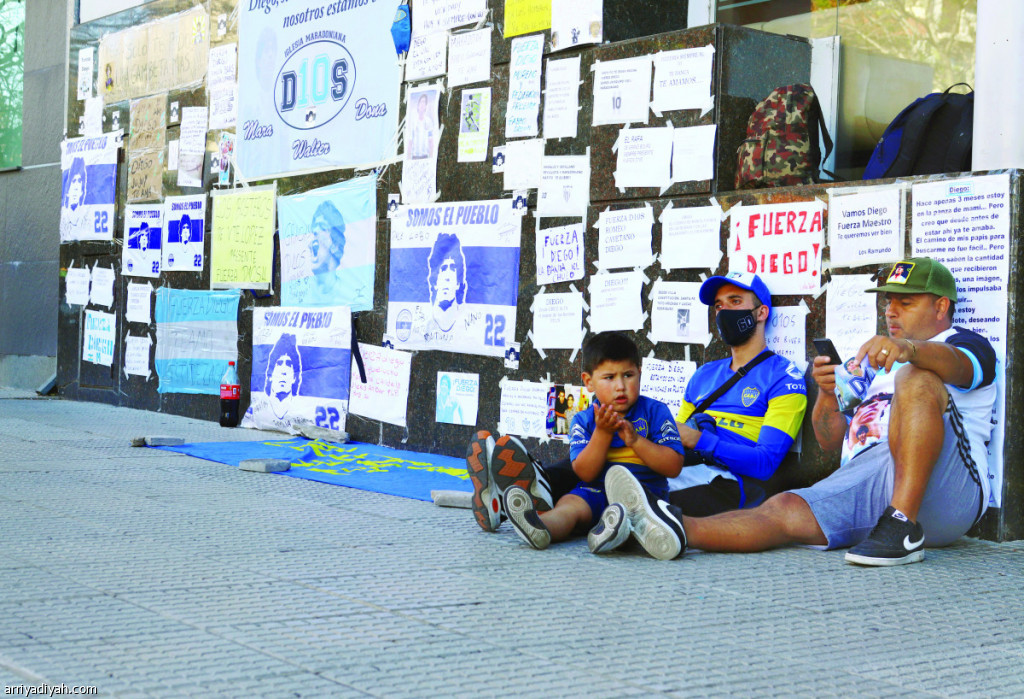 صورة التقطت أمس لجماهير أرجنتينية تجلس إلى جوار جدار عليه رسائل مشجعة لمارادونا خارج العيادة في أوليفوس في ضواحي بوينس أيرس (رويترز)