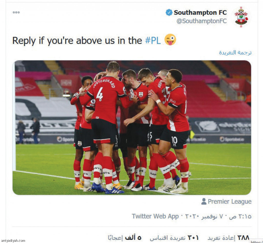 “قم بالرد إذا كنت أعلى منّا في الجدول”، تغريدة ساخرة أطلقها نادي ساوثهامبتون، عبر حسابه في موقع “تويتر”، بعدما تصدر ترتيب الدوري الإنجليزي الممتاز لكرة القدم، للمرة الأولى منذ نحو 32 عامًا.