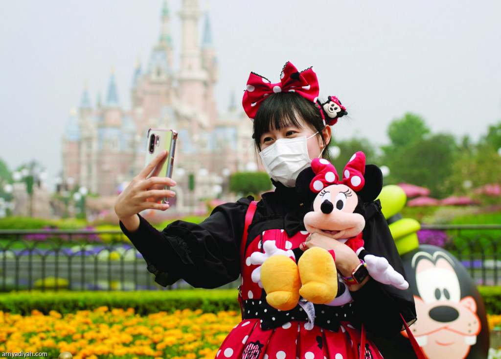 صورة التقطت أمس الأول لزائرة مرتدية زي شخصية ديزني تأخذ صورة سيلفي في منتجع شنغهاي ديزني بعد إعادة افتتاحه (رويترز)