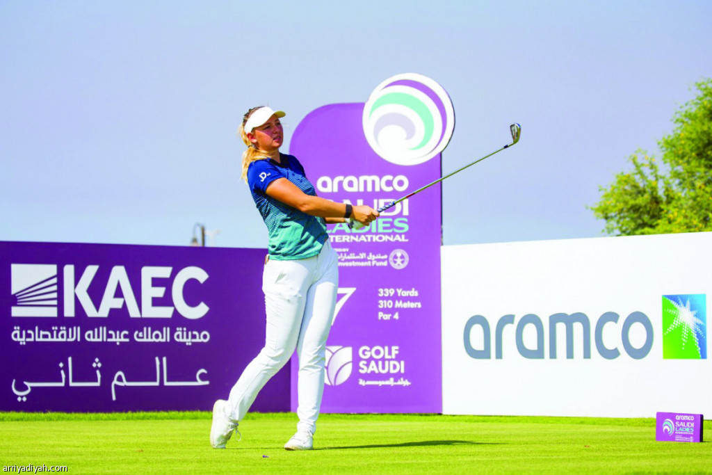 صورة التقطت أمس للدنماركية إيميلي كريستين بيديرسن لاعبة الجولف المحترفة توجه الكرة بالمضرب صوب إحدى الحفر في ثاني أيام الجولة التمهيدية من بطولة أرامكو السعودية النسائية..