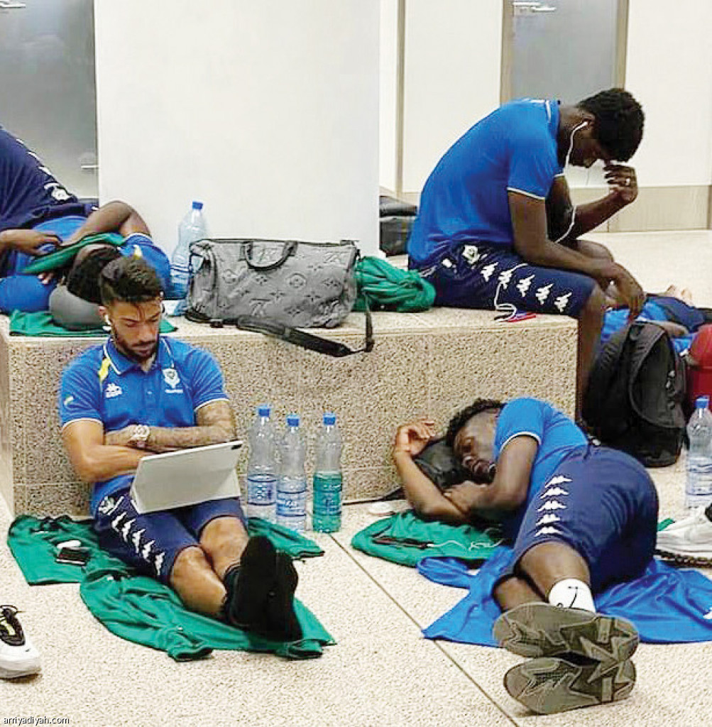 صورة التقطت أمس للاعبي الجابون ينامون على الأرض في المطار (حساب منتخب الجابون ـ فيسبوك)