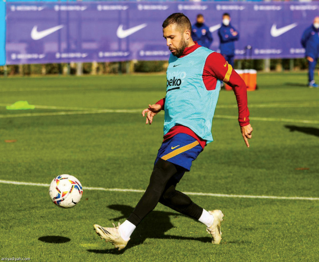 صورة التقطت أمس الأول من تدريبات فريق برشلونة.. ويظهر الإسباني ألبا (موقع برشلونة ـ تويتر)