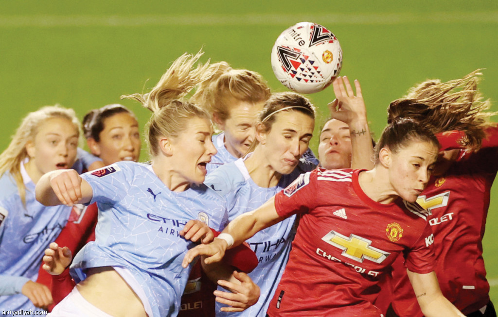 صورة التقطت أمس من مباراة فريقي مانشستر يونايتد ومانشستر سيتي للسيدات، ضمن منافسات كأس الاتحاد الإنجليزي لكرة القدم في مدينة مانشستر، وكسبها يونايتد بركلات الترجيح 4ـ3 ليتأهل إلى الدور الثاني (رويترز)