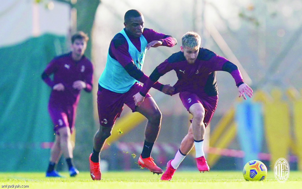 صورة التقطت أمس للبلجيكي أليكسيس ساليمايكيرس لاعب الوسط والفرنسي بيير كياتينجوا الظهير الأيمن في صراع على الكرة أثناء الحصة التدريبية لفريق ميلان الإيطالي الأول لكرة القدم (المركز الإعلامي ـ ميلان)
