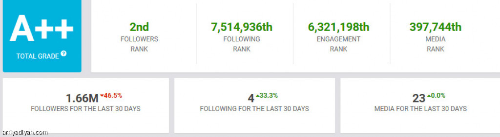ولم تشهد منشورات رونالدو زيادة إذ اكتفى بـ 23 منشورًا خلال تلك الفترة، حسب “شوشيال بليد”. وكان اليوم المميز بالنسبة إلى المتابعين هو العاشر من نوفمبر الجاري، إذ انضم إلى الحساب 202.909 متابعين جدد.
