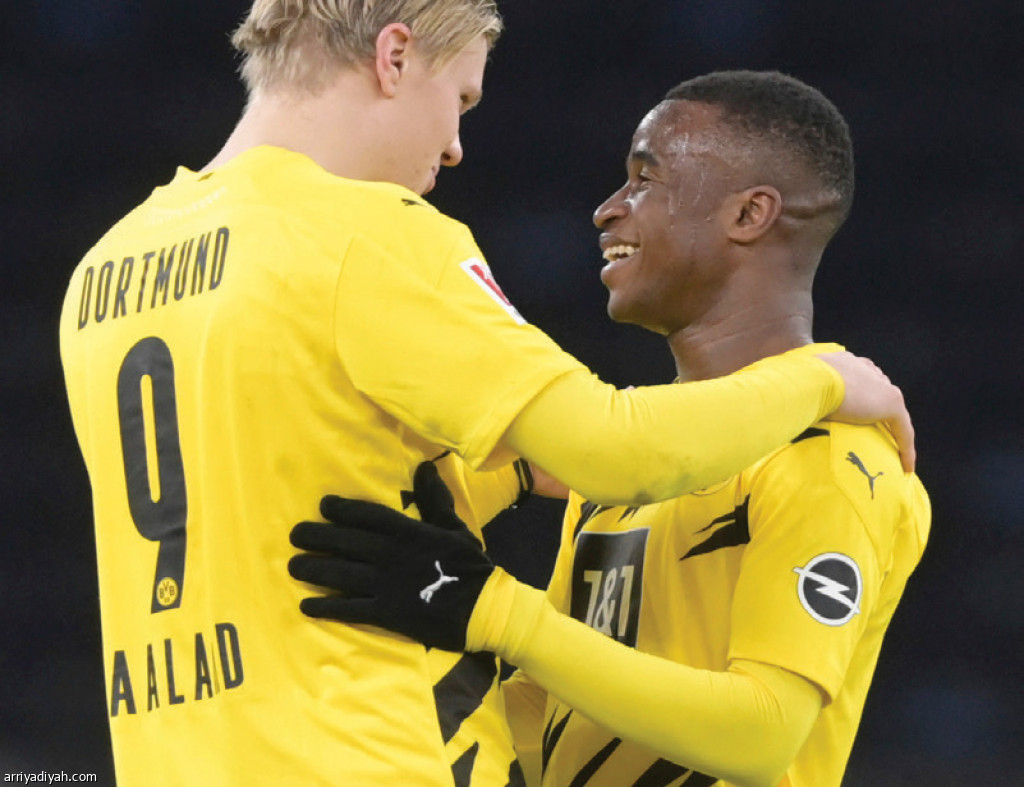 صورة التقطت أمس ليوسوفا موكوكو يتبادل التهاني مع إيرلينج هالاند، زميله في دورتموند، بعد نهاية المباراة (أسوشيتد برس)