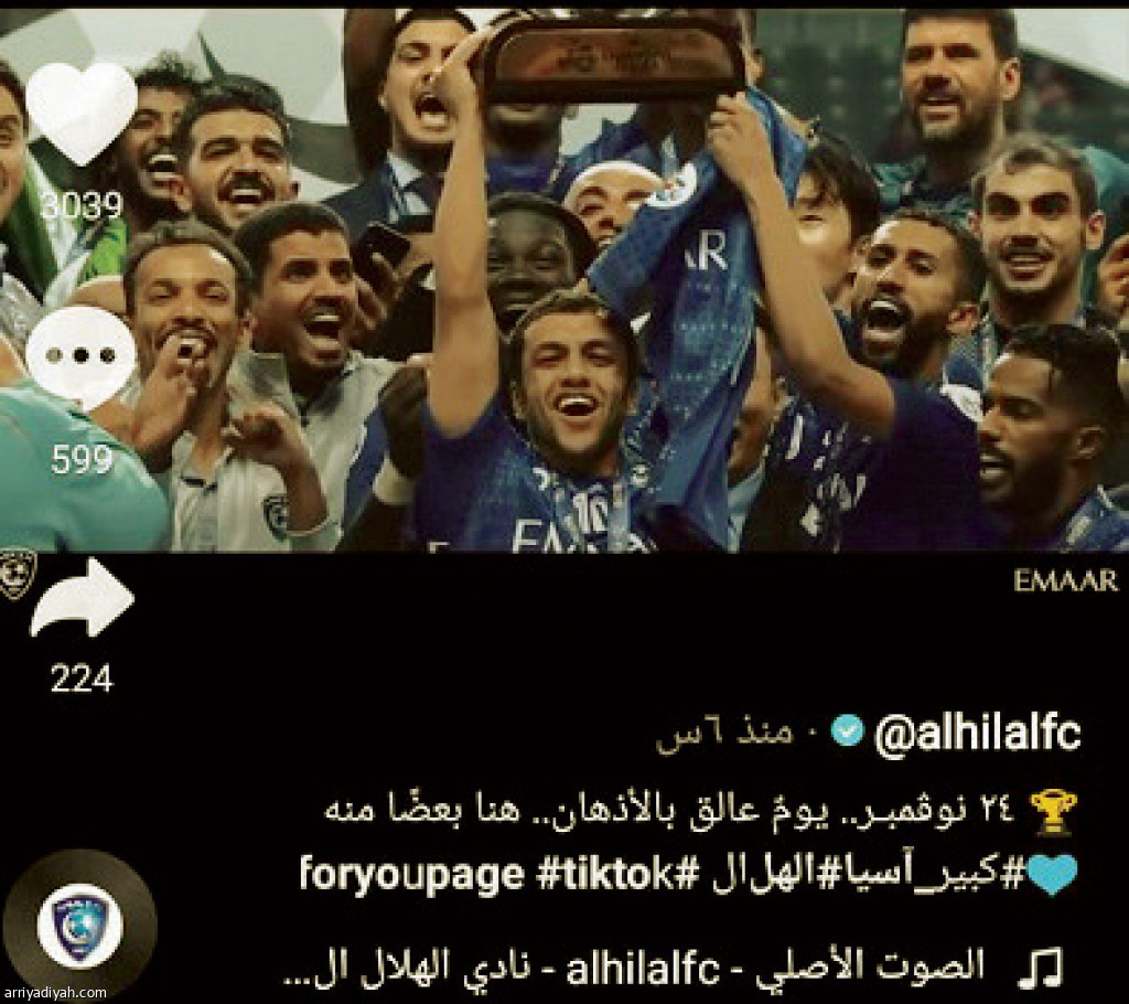 فيما استهل المركز الإعلامي للهلال نشاط يوم أمس من خلال صورة جماعية عبر حساب الطائر الأزرق للاعبين، يحملون كأس آسيا وعلق قائلًا “صباح السابعة” قبل أن ينشر فيديو لذكريات الاحتفالية بالبطولة في جميع المنصات تضمن هدفي مباراة الإياب وفرحة اللاعبين في الملعب وغرفة الملابس، وعلق عليه “24 نوفمبـر.. يومٌ عالق بالأذهان.. هُنا بعض منه”.