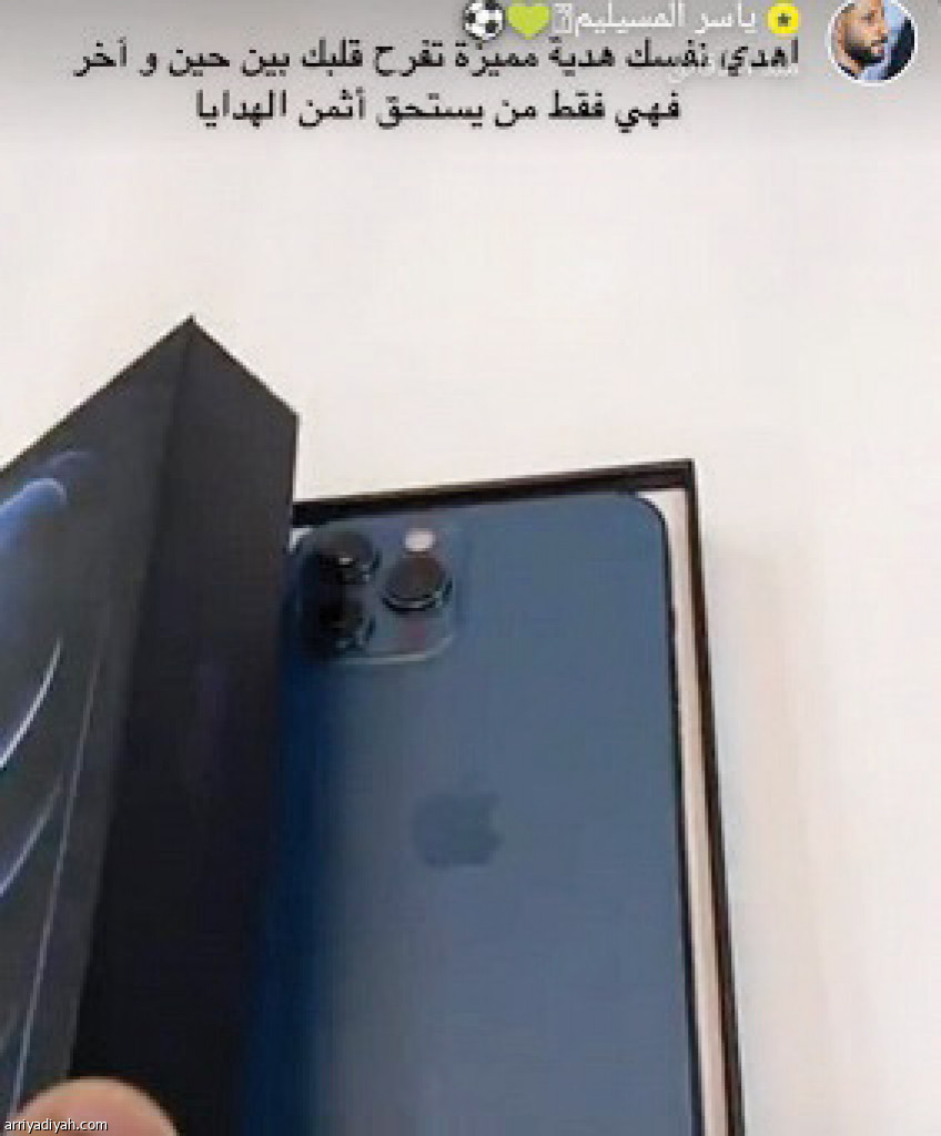 استعرض ياسر المسيليم حارس فريق الأهلي الأول لكرة القدم، عبر حسابه على سناب شات، فيديو لجهاز آيفون حديث، فيما علق قائلًا: “أهدِ نفسك هدية مميزة.. تفرح قلبك بين حين وآخر، فهي فقط من يستحق أثمن الهدايا”.