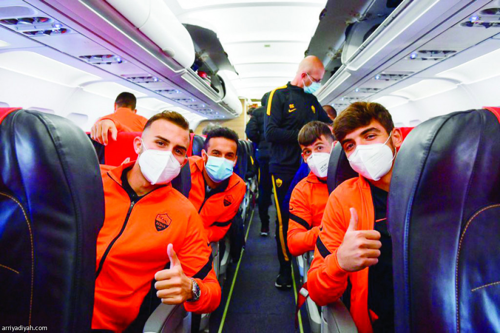 صورة التقطت أمس للاعبي روما داخل الطائرة في طريقهم إلى رومانيا لمواجهة كلوج (حساب روما - إنستجرام)