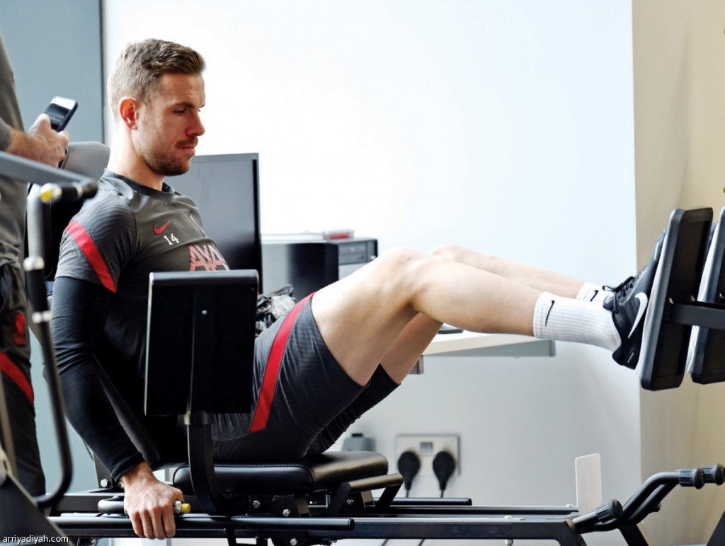 صورة التقطت أمس لجوردان هندرسون لاعب فريق ليفربول أثناء التدريبات في الصالة (حساب ليفربول -تويتر)