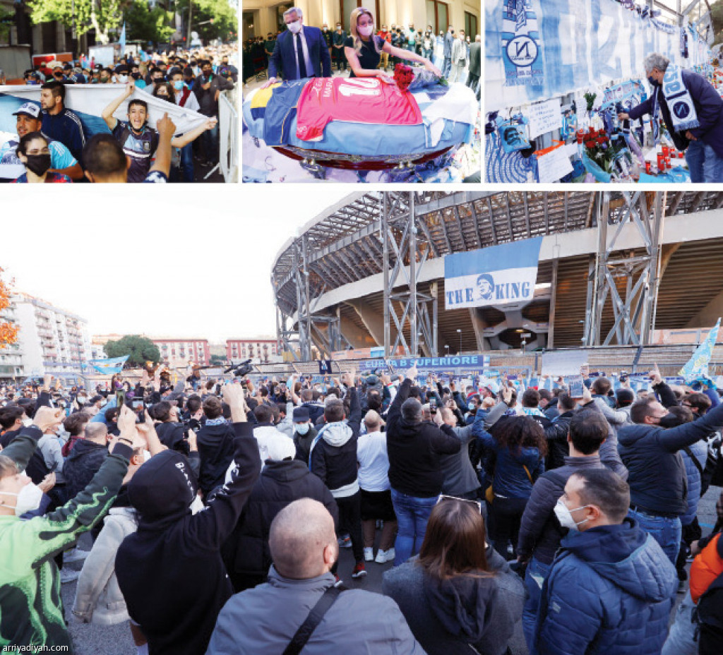 صور التقطت أمس لجموع غفيرة احتشدت خارج ملعب مارادونا في بيونس إيرس العاصمة الأرجنتينية ومدينة نابولي الإيطالية لتوديع أسطورة الكرة الذي توفي أمس الأول إثر أزمة قلبية بعد معاناة من المرض
