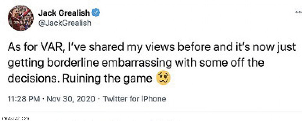 تفاعل المغردون في موقع التواصل الاجتماعي “تويتر” بشكل كبير، مع تغريدة الإنجليزي جاك جريليش لاعب فريق إستون فيلا الأول لكرة القدم، التي طالب فيها بإيقاف تقنية الـ var بعد إلغاء هدفه في شباك وست هام وخروجه فريقه خاسرًا.