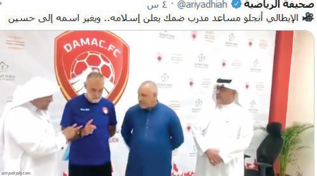 حقق الفيديو الذي نشره حساب “الرياضية” على موقع التواصل الاجتماعي “تويتر”، لإعلان الإيطالي أنجلو مساعد الجزائري نور الدين زكري مدرب فريق ضمك الأول لكرة القدم، دخوله الإسلام، وتغيير اسمه إلى حسين، تفاعلًا كبيرًا بلغ 450 ألفًا. وبلغت مشاهدات الفيديو 90 ألف مشاهدة خلال أربع ساعات، إلى جانب 360 ألف ظهور للتغريدة، و1.5 ألف تفضيل.