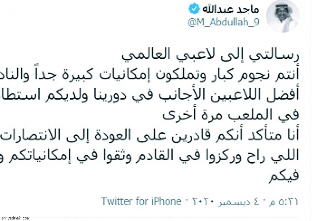 تفاعلت جماهير النصر بشكل كبير مع رسالة ماجد عبد الله، أسطورة كرة القدم السعودية، التي وجهها إلى لاعبي الفريق الأول لكرة القدم، عبر حسابيه على موقع التواصل الاجتماعي “تويتر” ومنصة انستجرام، والتي أكد لهم فيها قدرتهم على العودة إلى الانتصارات، وطالبهم فيها بنسيان الماضي.