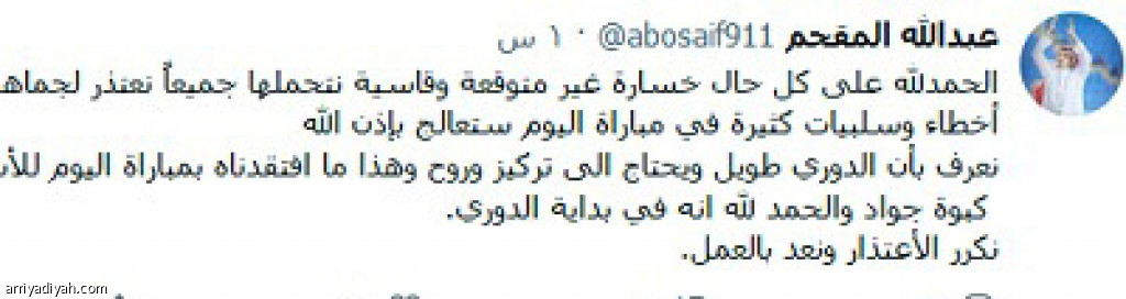 اعتذر عبد الله المقحم، رئيس نادي الحزم، في حسابه على موقع “تويتر”، للجماهير بعد الخسارة التي تعرض لها الفريق أمام العدالة “1ـ4”، ضمن الجولة التاسعة من دوري الأمير محمد بن سلمان لأندية الأولى. وقال المقحم، في تغريدته: “خسارة غير متوقعة وقاسية نتحملها جميعًا.. نعتذر لجماهيرنا، أخطاء وسلبيات كثيرة في المباراة، نعرف بأن الدوري طويل ويحتاج إلى تركيز وروح، وهذا ما افتقدناه ”.