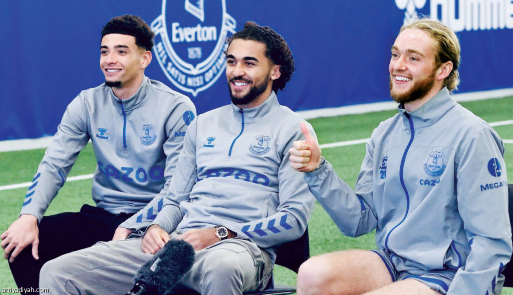 صورة التقطت أمس لتوم ديفيز وكالفيرت لوين وبن جودفري لاعبي فريق إيفرتون في بث مباشر مع الأطفال المرضى في مستشفى ألديرهي في ليفربول (المركز الإعلامي - إيفرتون)