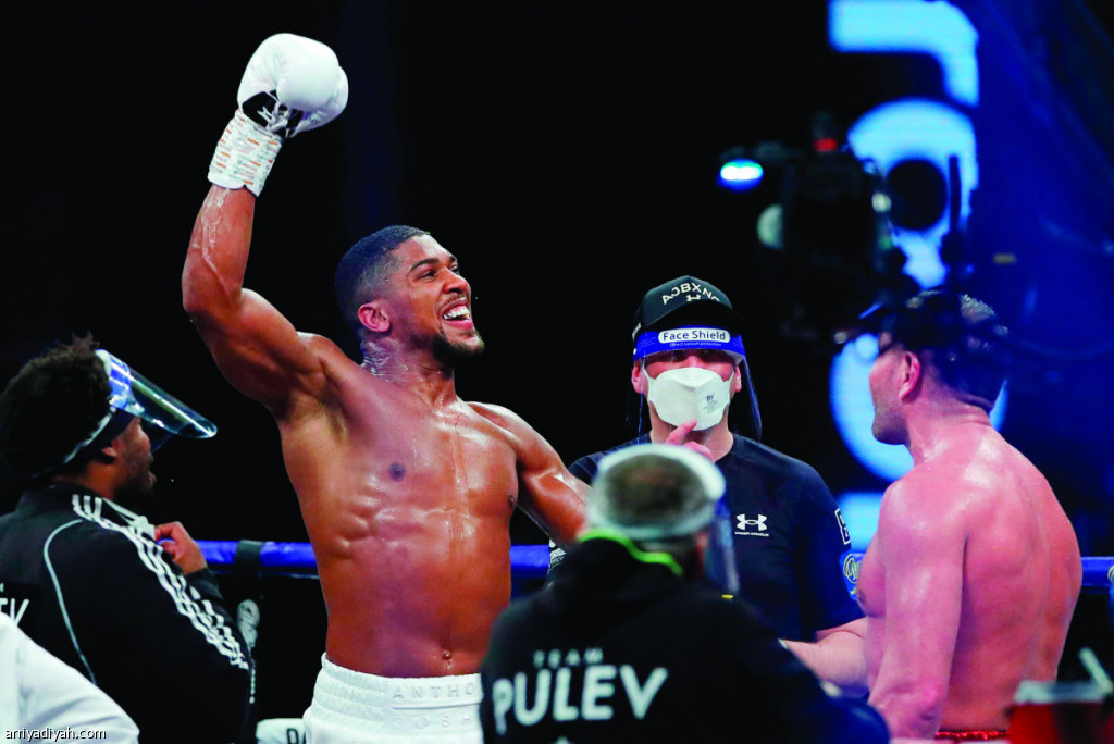 صورة التقطت أمس الأول لجوشوا يحتفل بفوزه على البلغاري كوبرات بوليف بالضربة القاضية (الفرنسية)