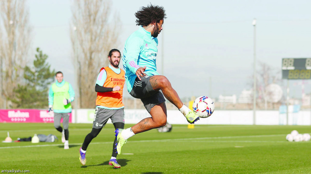 يسعى فريق ريال مدريد الإسباني الأول لكرة القدم، المنتشي بالفوز على أتلتيكو مدريد في ديربي العاصمة، إلى اللحاق بمتصدري الدوري عندما يستقبل أتلتيك بلباو اليوم، بينما يخوض برشلونة امتحانًا صعبًا ومهمًّا عندما يستضيف ريال سوسييداد المتصدر بعد غدٍ، في مباراتين مقدّمتين من المرحلة الـ 19. وتخوض الفرق الأربعة المباراتين باكرًا لانشغالها بكأس السوبر، حيث يستضيف ملعب “لا كارتوخا” في إشبيلية النهائي في 17 يناير المقبل، فيما ستكون مباراتا نصف النهائي في 13 و14 من الشهر ذاته في إشبيلية أو ملقة أو قرطبة.. وفي الصورة التي التقطت أمس الأول البرازيلي مارسيلو الظهير الأيسر للريال يحاول السيطرة على الكرة في تدريبات الفريق (المركز الإعلامي - الريال)
