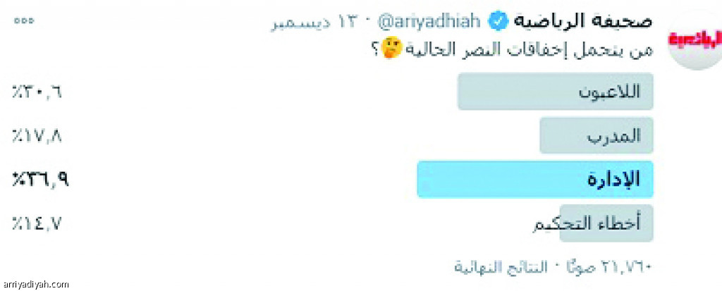 حمّل النصراويون المشاركون في استفتاء حساب “الرياضية” على موقع التواصل الاجتماعي “تويتر” إدارة النادي مسؤولية إخفاق الفريق الأول لكرة القدم.