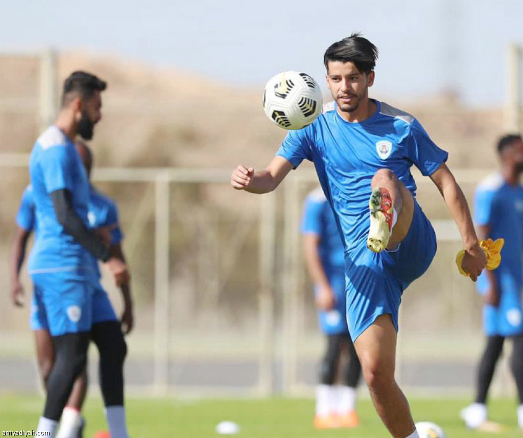 صورة التقطت أمس للتونسي سعد بقير لاعب أبها يستعرض بالكرة أثناء التدريبات.. ويبدو أحمد الحبيب زميله في الفريق (المركز الإعلامي ـ أبها)