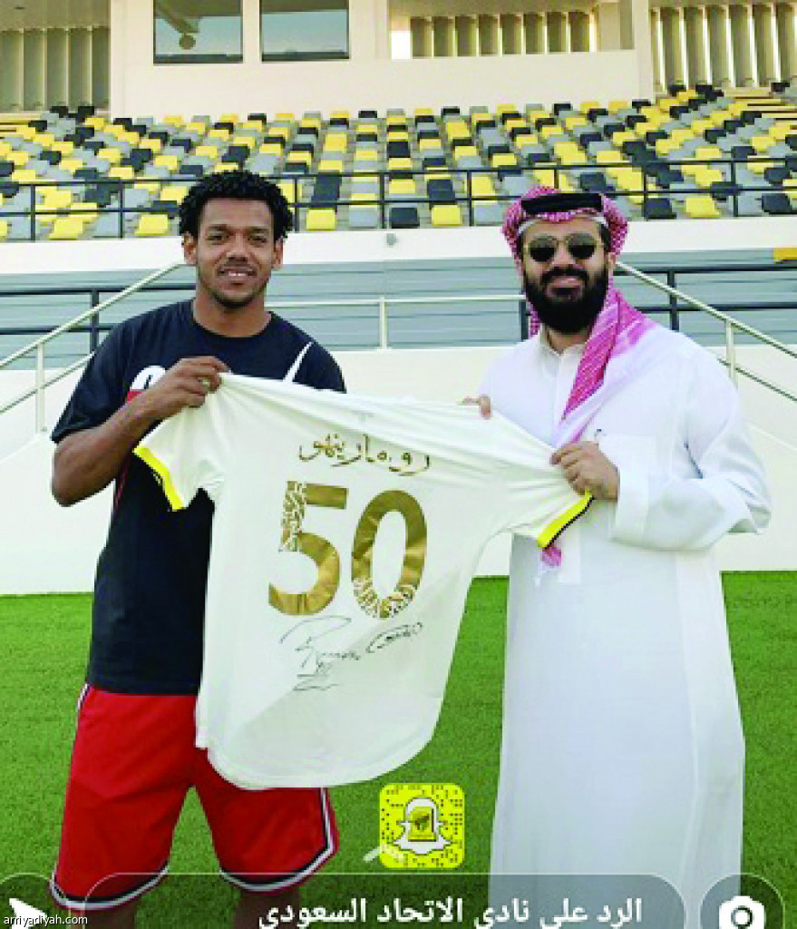 نشر حساب نادي الاتحاد عبر “سناب شات” صورة لأنمار الحائلي، رئيس النادي، يسلم البرازيلي رومارينيو، مهاجم الفريق الأول لكرة القدم، قميصًا يحمل اسمه برقم 50، احتفاءً بتسجيله 50 هدفًا خلال مسيرته مع الفريق.
