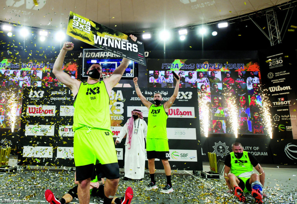 صورة التقطت أمس للاعبي فريق ريجا اللاتفي يحتفلون باللقب بعد فوزهم على ليمان الصربي في نهائي البطولة العالمية تصوير: علي خمج