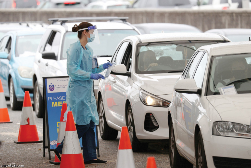 صورة التقطت أمس لممارسة صحية في مركز فحص كورونا للأشخاص بداخل السيارات في مدينة سيدني الأسترالية (رويترز)