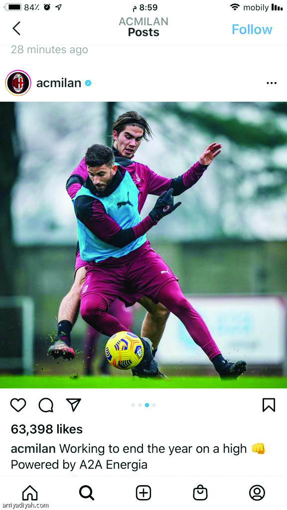 شارك حساب نادي ميلان الإيطالي على إنستجرام متابعيه بصور من تدريبات الفريق الأول لكرة القدم أمس استعدادًا لمباراة لاتسيو غدًا. وعلق على المنشور قائلًا “عمل جاد لإنهاء العام على أعلى مستوى”.