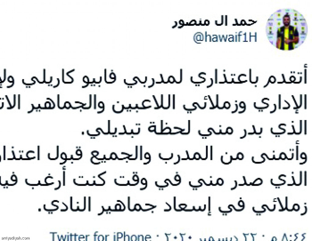 تفاعلت جماهير الاتحاد بشكل كبير مع تغريدة حمد آل منصور لاعب الفريق الأول لكرة القدم عبر حسابه على موقع التواصل الاجتماعي “تويتر” والتي أعلن فيها اعتذاره للموقف الذي بدر منه بعد استبداله في مباراة الرائد أمس الأول. وشمل اعتذار المنصور، البرازيلي كاريلي مدرب الفريق والجهاز الإداري وزملاءه اللاعبين والجماهير، فيما برره بأنه كان يريد المساهمة في إسعاد الجماهير.