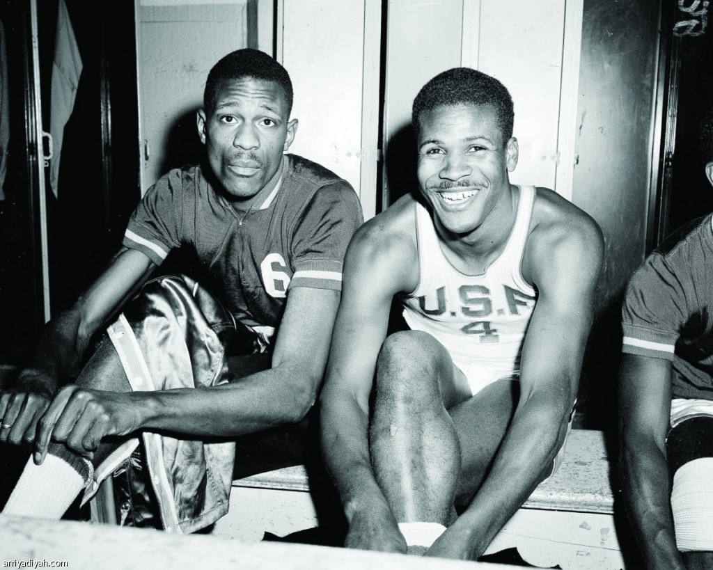 صورة التقطت في 1 مارس 1956 وبُثَّت أمس تجمع جونز قائد جامعة سان فرانسيسكو في اليمين مع بيل راسل زميله في الفريق (أسوشيتد برس)