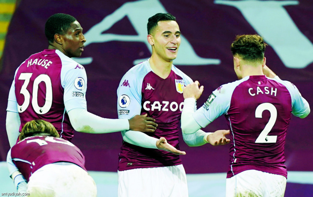 صورة التقطت أمس لأنور الغازي لاعب أستون فيلا يحتفل مع أحد زملائه بعد تسجيل الهدف الثالث على كريستال بلاس(الأوروبية )