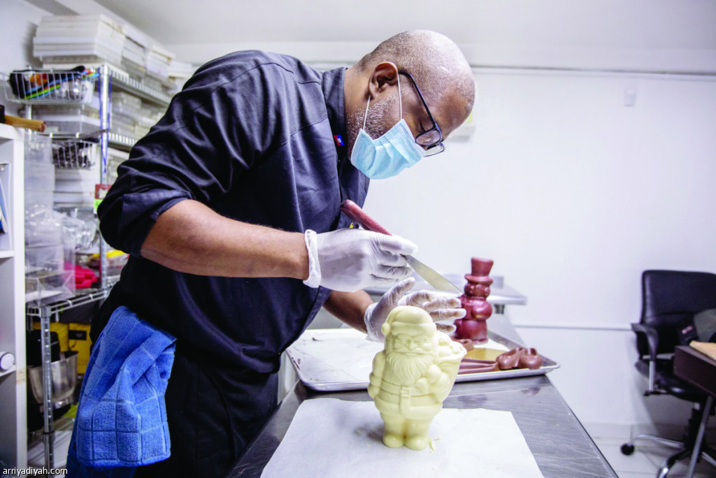 صورة التقطت أمس لرالف ليروي أحد العاملين في مجال الكاكاو يجهز مجسمًا من الشوكولاتة في بيتيونفيل في هايتي (الفرنسية)
