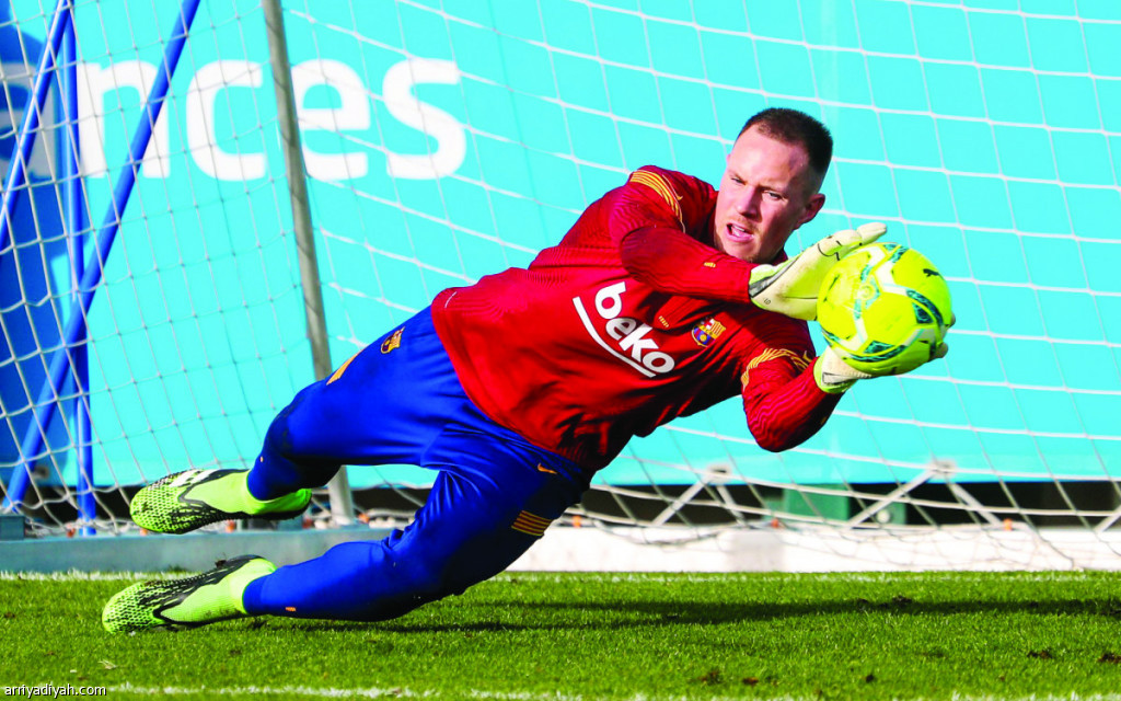 صورة التقطت أمس للألماني تير شتيجن حارس فريق برشلونة خلال التدريبات استعدادًا للقاء إيبار غدًا(المركز الإعلامي ـ برشلونة)
