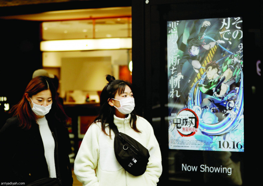 صورة التقطت أمس لامرأتين ترتديان الكمامات الوقائية في أحد الأسواق في طوكيو ويظهر بوستر فيلم “ديمن سلاير“ خلفهما(رويترز)