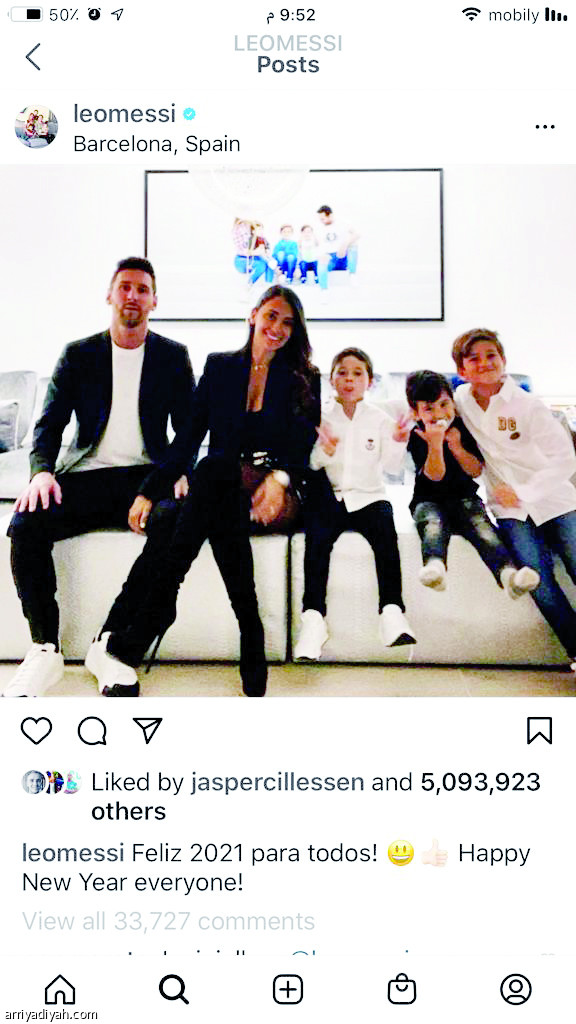 بدأ الأرجنتيني ليونيل ميسي، قائد فريق برشلونة، العام الجديد على إنستجرام بـ 235.671 متابعًا جديدًا ليرتفع الإجمالي إلى 174.495 مليون. وجمع ميسي في أول يوم في العام الجديد 198.783، معوضًا خسارته في اليوم السابق والتي بلغت 28.756 متابعًا. وواصل الحساب جمع الأرقام أمس وحصد 126.830 متابعًا. وإجمالًا جمع ميسي خلال الـ 30 يومًا الماضية 4.645 مليون متابع.