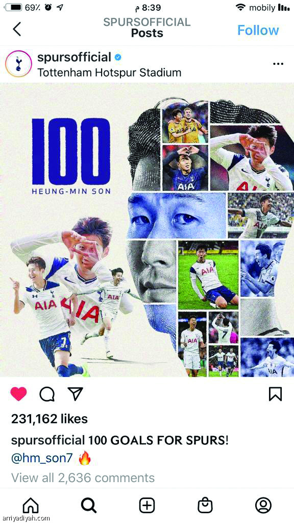 جاء الكوري سون هيونج مين، مهاجم فريق توتنهام الإنجليزي الأول لكرة القدم، نجم حسابي النادي على تويتر وإنستجرام، بعد أن وقع أمس على هدفه رقم 100 للفريق في كافة المنافسات أمام ليدز يونايتد في الدوري “3ـ0”.
