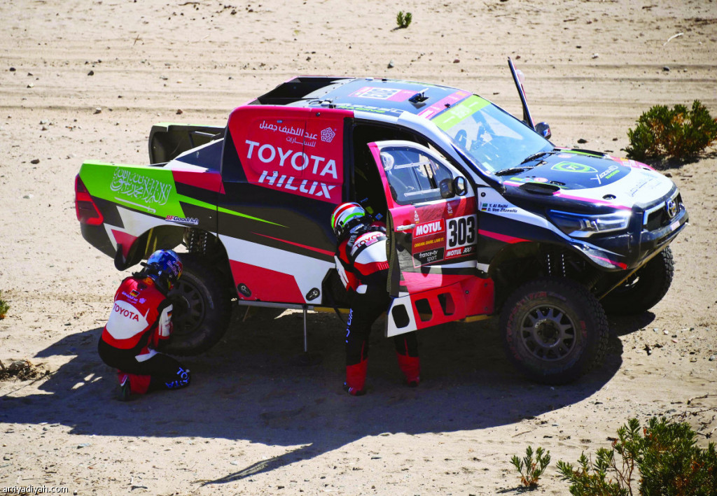 صورة التقطت أمس ليزيد الراجحي يستبدل الإطارات خلال سباق رالي داكار (الأوروبية)