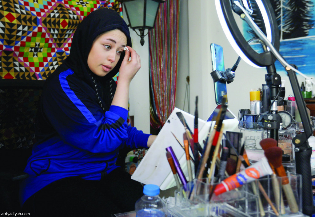 صورة التقطت أمس لآلاء بليحة تستخدم المكياج أثناء ممارستها هوايتها في منزلها في عمَّان (رويترز)