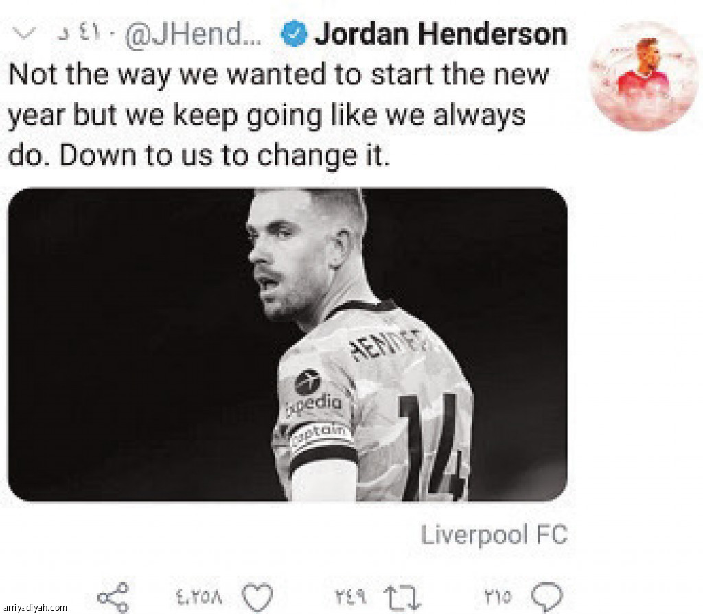 أبدى الإنجليزي جوردان هندرسون، قائد فريق ليفربول، حسرته الكبيرة على الخسارة أمام ساوثهامبتون، حيث قال في تغريدة عبر حسابه على “تويتر”: “ليست الطريقة التي أردنا أن نبدأ بها العام الجديد.. ولكننا نستمر كما كنّا دائمًا في العودة السريعة إلى الانتصارات”.