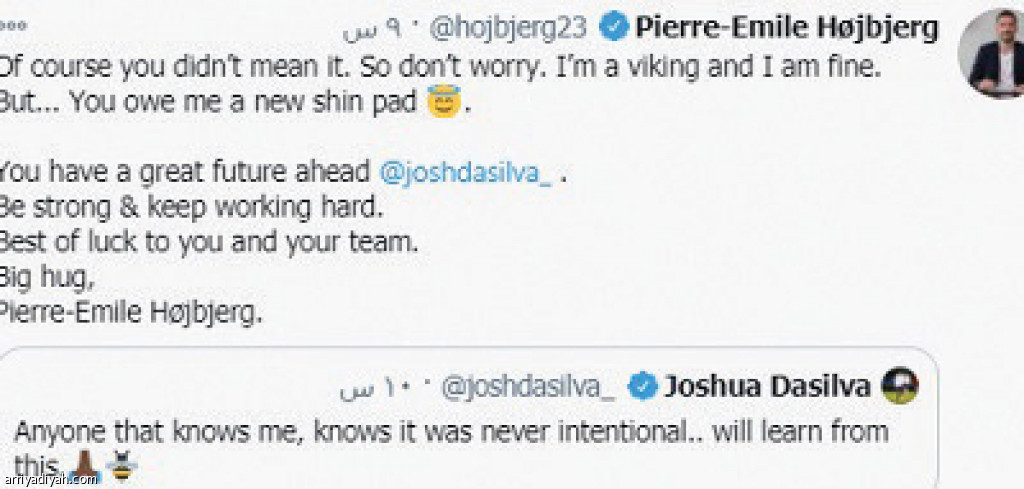 اعتذر الإنجليزي جوشوا دا سيلفا، لاعب فريق برينتفورد الأول لكرة القدم، عبر حسابه على موقع التواصل الاجتماعي “تويتر” للدنماركي بيير هوجبيرج، لاعب توتنهام، بعد الإصابة التي سببها لها في مباراة الفريقين أمس الأول ومنح بسببها بطاقة حمراء. وقال داسيلفا: “أي شخص يعرفني يعرف أنني لم أقصد إصابته.. سأتعلم من ذلك مستقبلًا”، قبل أن يعيد هوجبيرج نشر التغريدة، ومازحه قائلًا: “بالطبع أنت لا تعني ذلك، لذلك لا تقلق، أنا بخير.. لكن أنت مدين لي بوسادة ساق جديدة.. لديك مستقبل عظيم في المستقبل، كن قويًا واستمر في العمل الجاد”. وتفاعلت الجماهير بشكل كبير معهما، حيث بلغت الردود على تغريدتيهما 2.3 ألف، إضافة إلى 86 ألف إعجاب و11 ألف ريتويت.