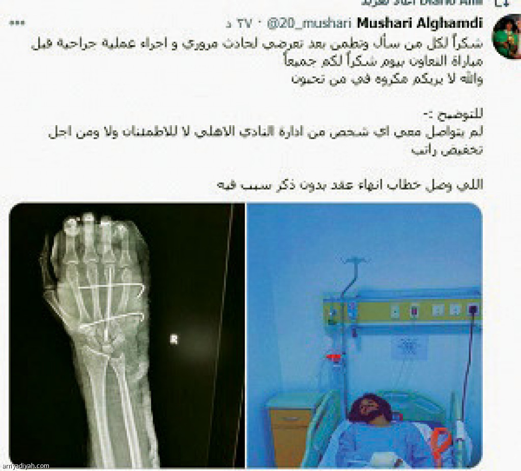تفاعل المغردون في موقع التواصل الاجتماعي “تويتر” بشكل كبير مع تغريدة مشاري الغامدي، مترجم فريق النادي الأهلي، بعد إعفائه من منصبه، والتي أكد فيها أن الإدارة لم تتواصل معه للاطمئنان على صحته أو تخفيض راتبه. وبلغت الردود على التغريدة التي تضمنت صورته في المستشفى بعد إجرائه عملية جراحية 2.5 ألف، حيث أصبحت من أكثر التغريدات الرياضية تفاعلًا، أمس، في الطائر الأزرق.