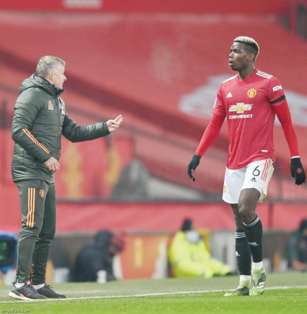 صورة التقطت أمس الأول لبوجبا مع مدربه سولشاير خلال مباراة مانشستر يونايتد أمام مانشستر سيتي في كأس إنجلترا (الفرنسية)