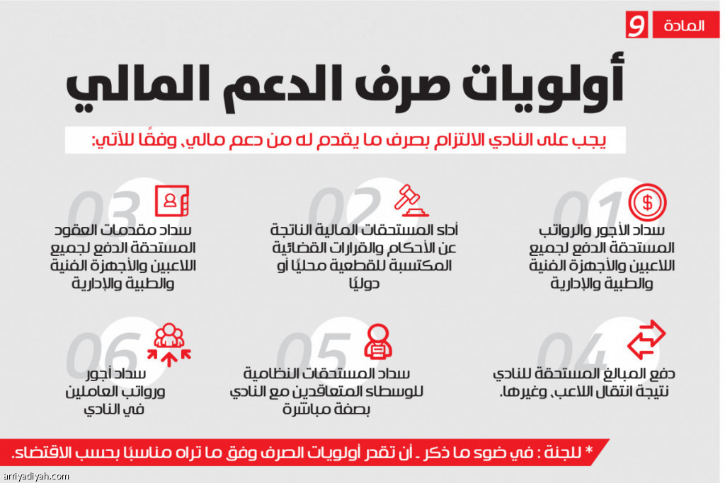 يجب على النادي الالتزام بصرف ما يقدم له من دعم مالي، وفقًا للآتي: