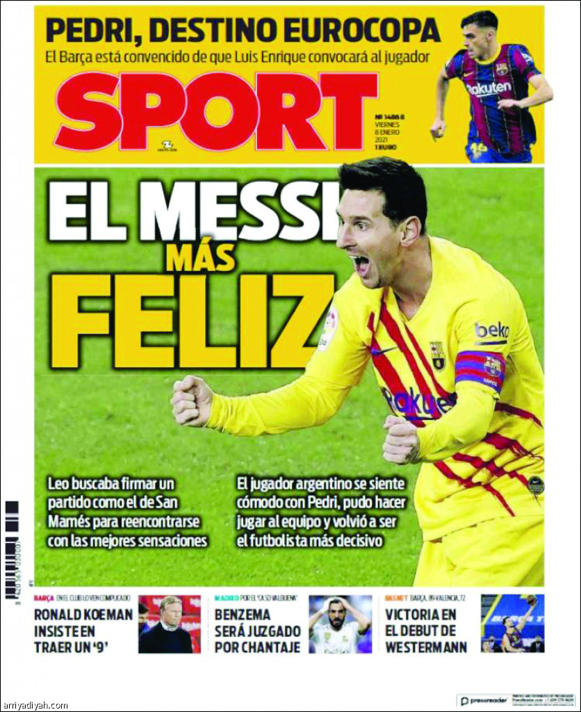 وتصدرت صورة ميسي، وهو يحتفل بهدفه الأول غلاف الصحيفة أمس، وعنونت عليها: “ميسي السعيد”.. وكتبت :” أراد ليو مباراة مثل مباراة سان ماميس للعودة إلى المسار الصحيح بأحاسيس أفضل”.. و”اللاعب الأرجنتيني يشعر بالراحة مع بيدري.